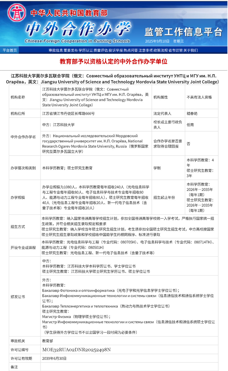 2025年9月,教育部正式批复,我校与俄罗斯国家研究型莫尔多瓦国立大学合作举办的“江苏科技大学莫尔多瓦联合学院”获批设立。这标志着我校首个